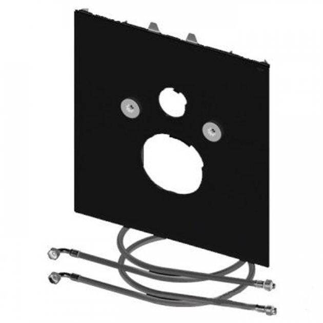 Нижняя стеклянная панель для унитазов TECEone с функцией биде, включая звукоизоляционный комплект и армированные шланги для подсоединения горячей и холодной воды к стандартным угловым вентилям.